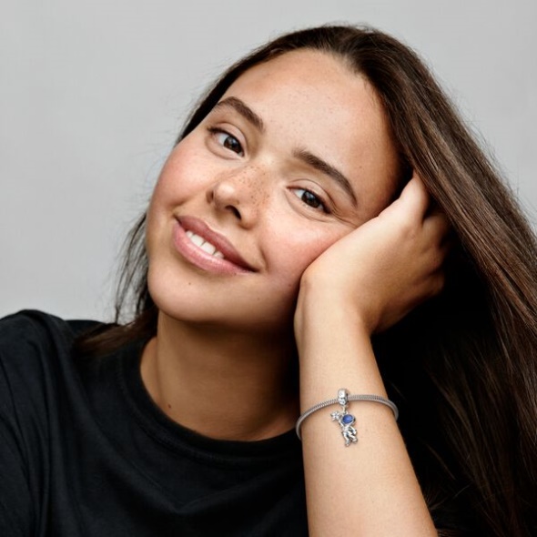 Explore the wonders of the galaxy with the Astronaut In The Galaxy Dangle Charm. In this sterling silver charm, a space explorer's suit is decorated with microbeads and a clear cubic zirconia stone forms the oxygen tank. Blue enamel illuminates the visor of the helmet. The astronaut's arm features a cut-out heart set with a sparkling stone and he holds a sparkling star set with clear cubic zirconia. This sweet starry charm is a reminder to reach for the skies.