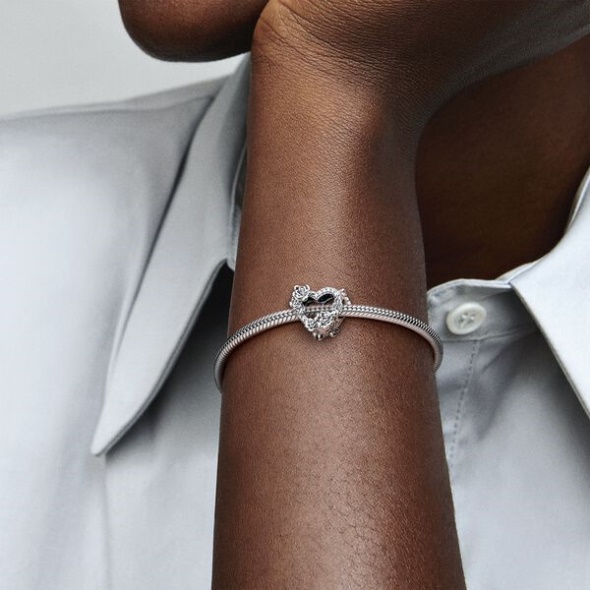 Express your true feelings with the Open Heart & Roselowers Charm. Hand-finished in sterling silver, this open heart design features intricate detailing. The heart-shaped front and back frames are embellished with decorative Roselower and leaf details and clear stones for added sparkle. The sides of the charm include Roselower engravings as well as Roseetal and heart cut-outs. Inspired by the epic love story of Romeo & Juliet, gift someone special this timeless design.