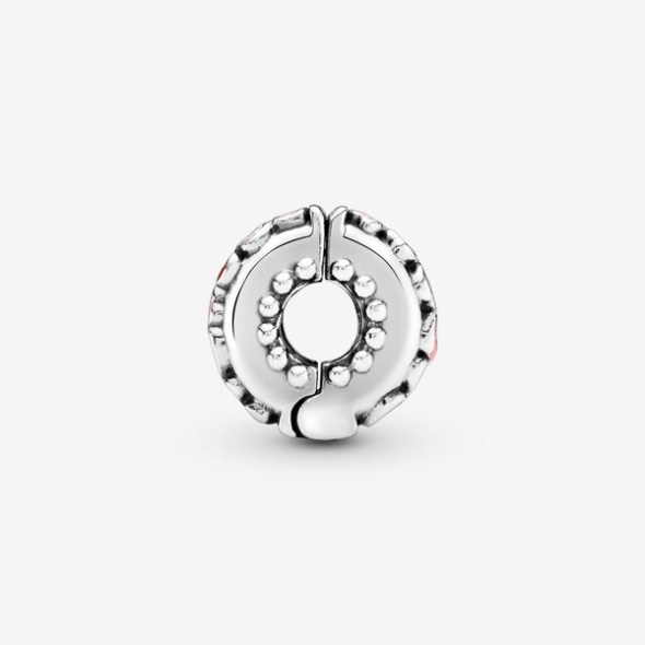 Tell your style love story with a red and pink Pandora clip charm. Perfect for stacking on your favorite Pandora Moments bracelets, the distinctive charm is hand finished in sterling silver and features miniature enamel hearts details in red and pink. Add it to your bracelet to space your favorite charm collection or wear it for a pop of color. This clip charm features no silicone grip, so it will slide if not styled onto threads (two raised charm dividers).